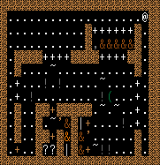 部屋に5つ散乱している!は酔っ払いの薬、部屋下側に2つ並んでいる!は致命傷の治癒の薬、小部屋に2つ入っている?はテレポートの巻物。